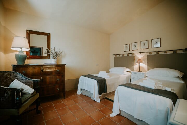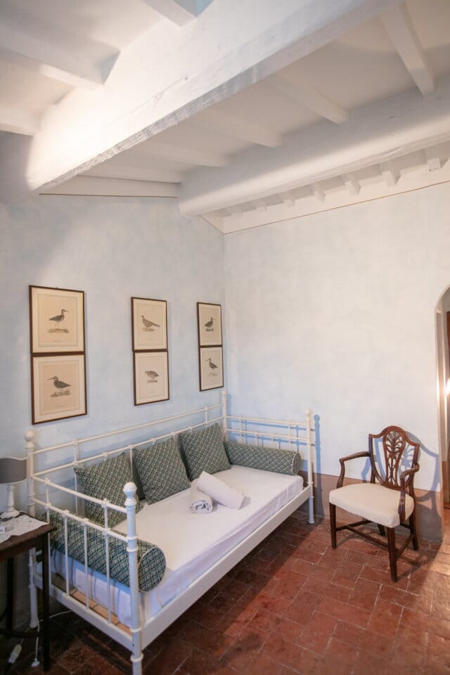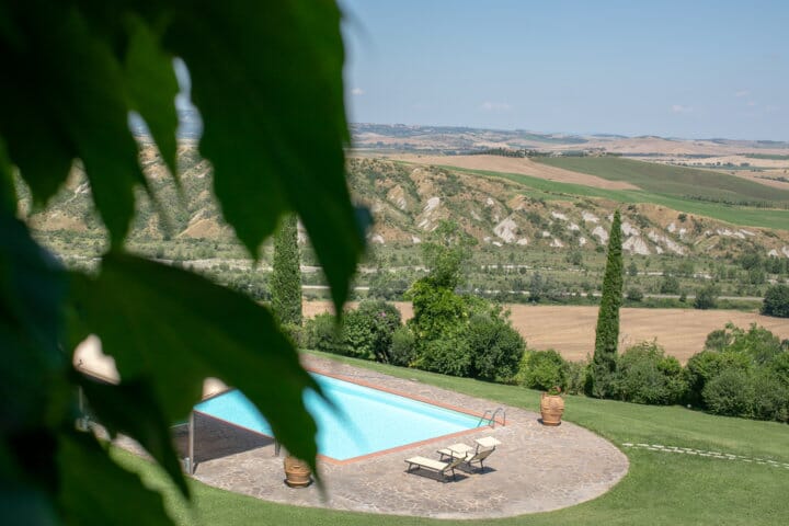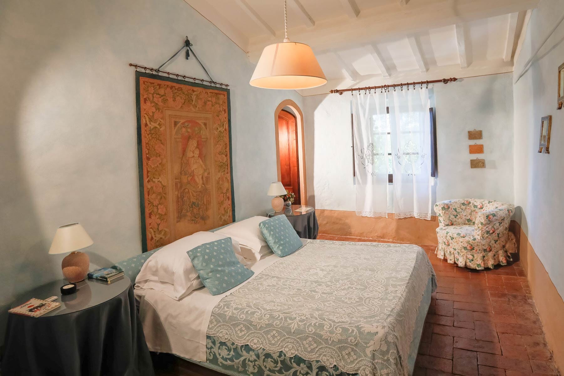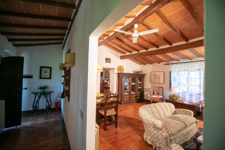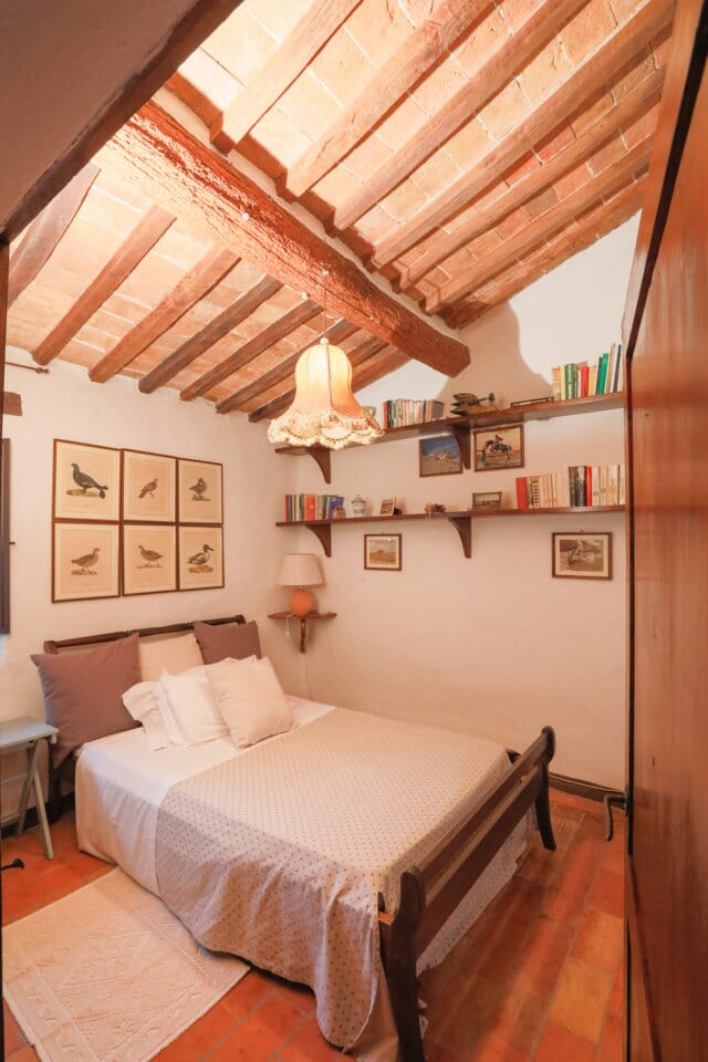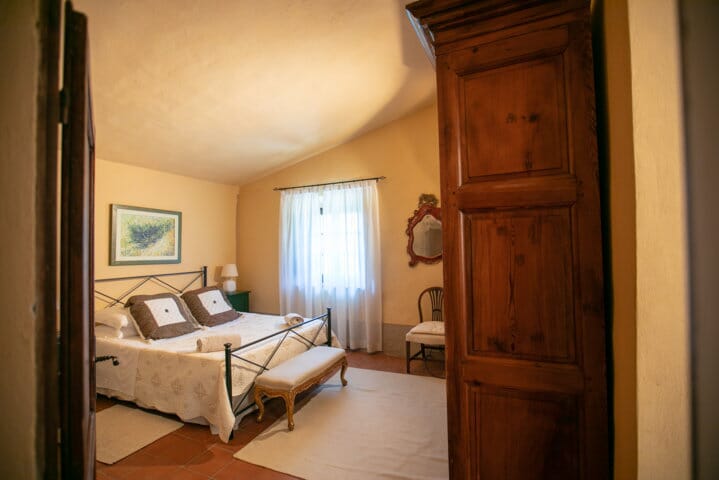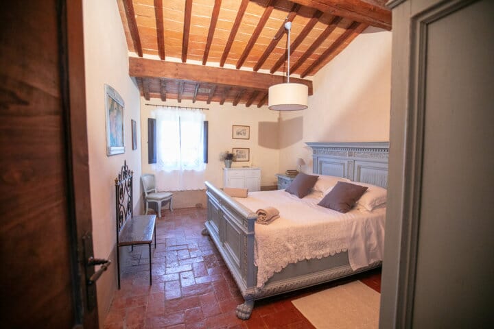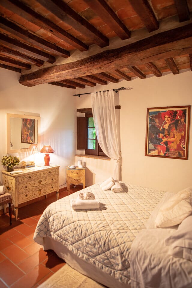 The stone apartment completely covered by American vine, overlooks the huge lawn of the swimming pool, suspended over a fantastic panorama between San Quirico, Castiglion d’Orcia and Pienza. The apartment is spread over two floors.